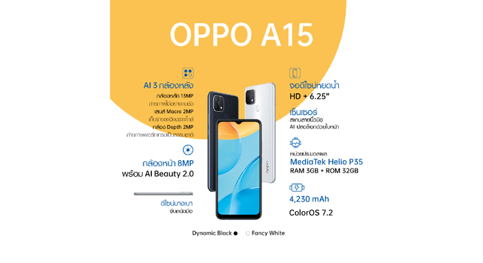 โดย OPPO A15 มาพร้อม MediaTek Helio P35, RAM 3GB และ ROM 32GB มีให้เลือก 2 สี คือ สีขาว Fancy White และสีดำ Dynamic Black ในราคา 4,299 บาท